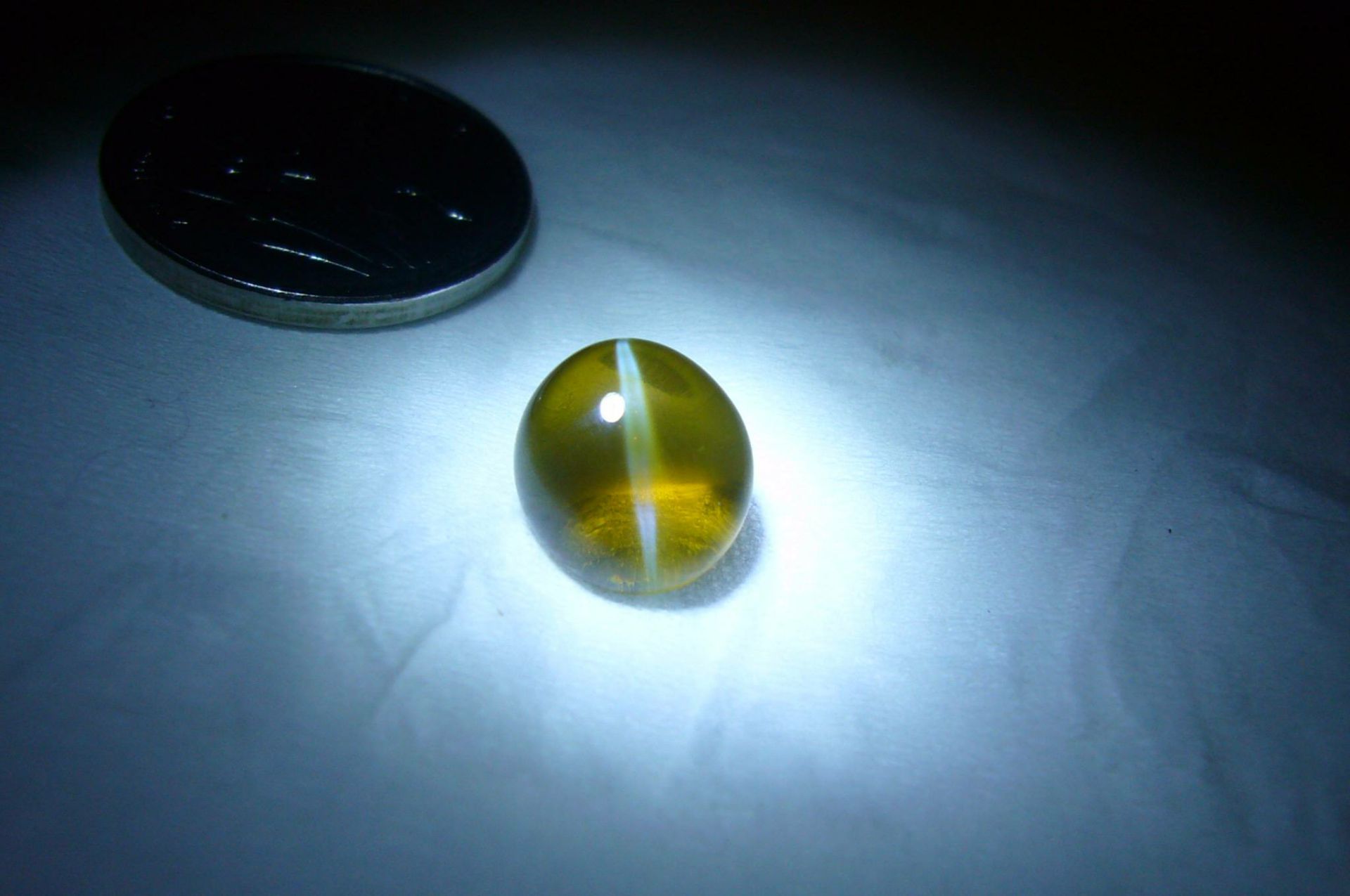 (4)表面弧度的高低:凸面型宝石的表面弧度高时,则以表现出的亮带细窄而明晰,表面弧度越低而接近于平面时,亮带粗而浑浊。